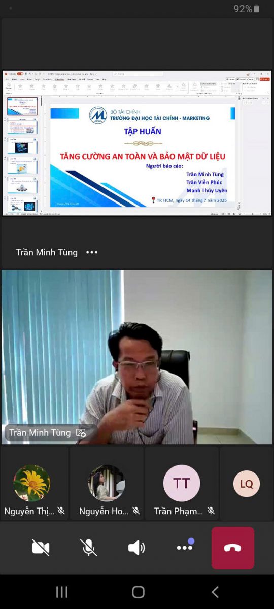 Thực hiện Thông báo số 2098/TB-ĐHTCM-QLTSCNTT ngày 08/7/2025 của Ban Giám hiệu Trường Đại học Tài chính – Marketing, Phòng Quản lý tài sản và Công nghệ thông tin đã tổ chức đợt tập huấn “Tăng cường an toàn và bảo mật dữ liệu” cho giảng viên, viên chức và người lao động toàn Trường vào ngày 14/7/2025 và ngày 21/7/2025. Chủ trì đợt tập huấn lần này là ThS. Trần Minh Tùng - Phó Trưởng phòng, Phòng Quản lý tài sản và Công nghệ thông tin. Tham gia hỗ trợ kỹ thuật đợt tập huấn có ThS. Trần Viễn Phúc và ThS. Mạnh Thúy Uyên là viên chức thuộc Phòng Quản lý tài sản và Công nghệ thông tin.